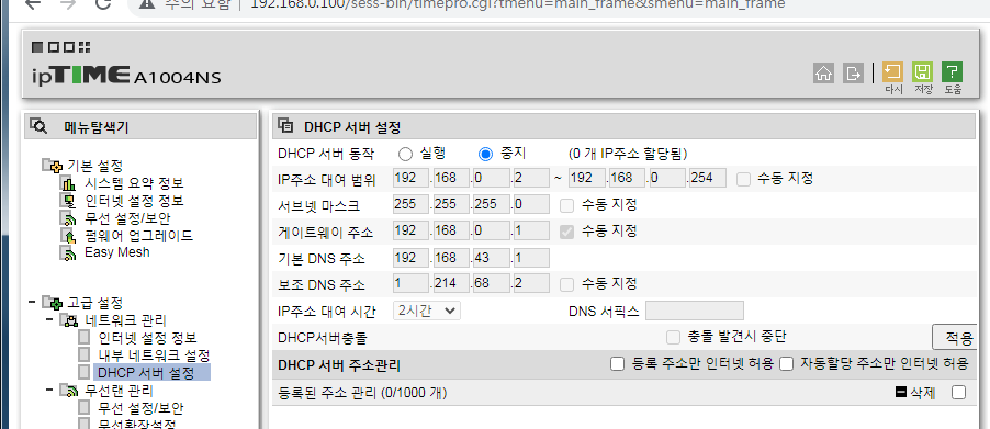 DHCP서버설정 > DHCP서버동작 > 중지 <<<중요3